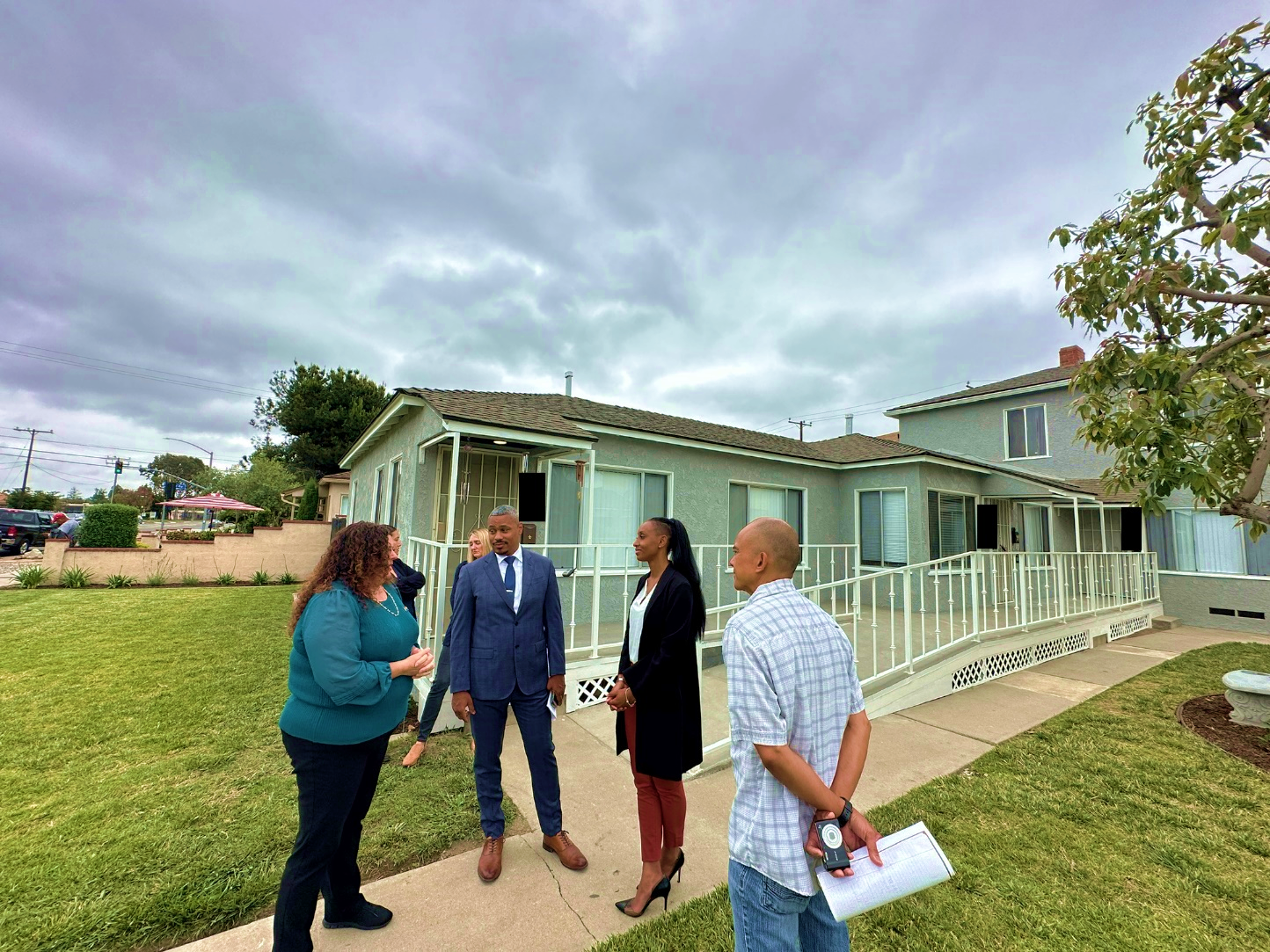 Long Beach District 5’s Councilwoman Kerr meets with HOPE Staff members: Charles Decuir (CFO), Shay Alexander (Asset Manager), and Joel Bautista (Jr. Asset Manager) outside of the HOPE home on Clark Avenue.
